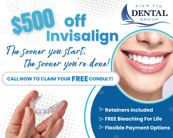 Ready to transform your smile? At Pier 210 Dental Group, enjoy $500 off Invisalign® clear aligners and start your journey to a straighter, more confident smile today!